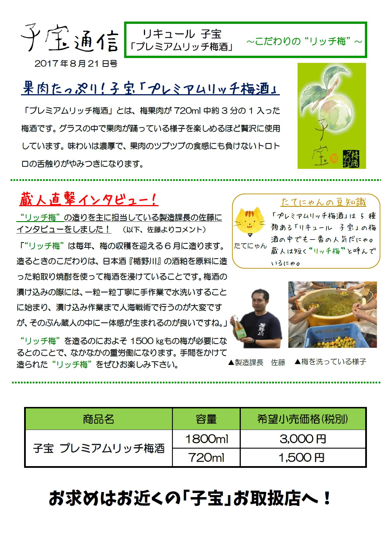 リキュール 子宝「プレミアムリッチ梅酒」のご紹介や楯の川酒造の蔵人による、こだわりをご説明いたします。