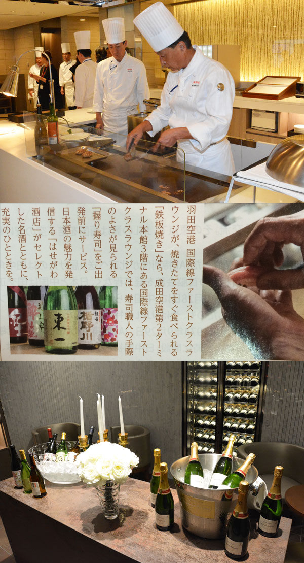 羽田空港 国際線「JALファーストクラスラウンジ」が2014年8月29日にリニューアルオープンされました。従来の3倍となるスペースを惜しみなく活用し、鉄板を使ったライブサービスや、靴磨きのサービス、左官職人による壁面アートなど、クオリティと日本流のおもてなしが特徴です。期間限定で、「楯野川 純米大吟醸 美山錦 超辛」がお楽しみいただけます。