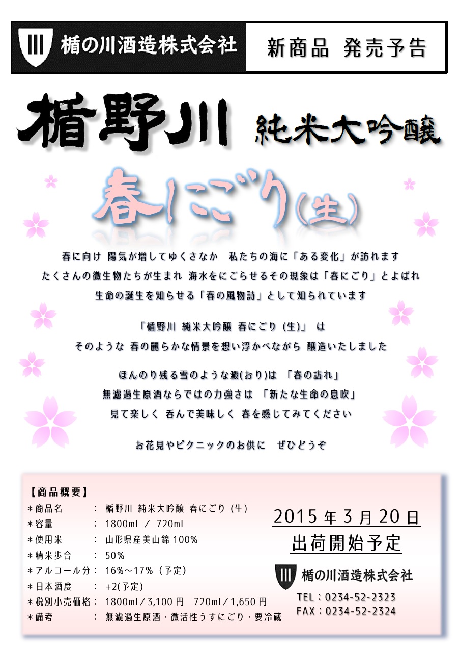 楯の川酒造株式会社は、新商品 「楯野川 純米大吟醸 春にごり(生)」を2015年3月20日(金)に発売いたします。