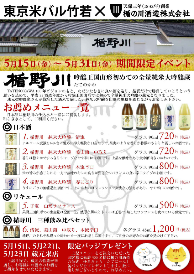 5月15日(金)~5月31日(金)まで、東京駅グランルーフ内にある「東京米バル竹若」さんにて「楯野川」杯売りキャンペーンを実施して頂きます。5月15日、22日、23日は、蔵のスタッフが来店しています。楯野川をご注文頂いたお客様には「たてにゃん缶バッチ」をプレゼントいたします。
