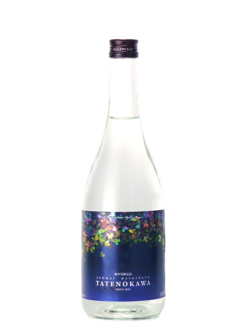 深い藍色の湖面。優雅に舞う玉虫色の蝶々。幻想的なデザインは「夏の夜の夢」をイメージしました。原紙にはツヤのある銀フォイル紙を採用。「TATENOKAWA」の文字には“浮出し加工”を、湖面に広がる波紋には“デボス(凹み)加工”を、そして、蝶々には金属のような光沢と立体感のある仕上がりとなる“リオトーン加工”を施しました。至る所に高度な技術を用いてこだわり抜いたラベルは、一見の価値ありです。