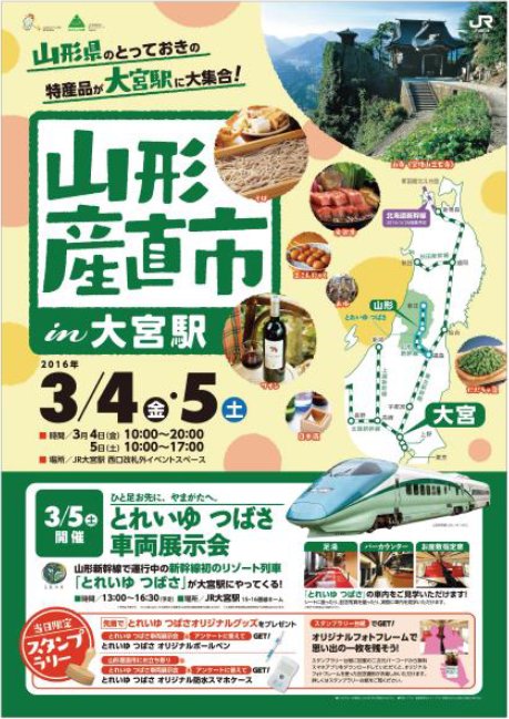JR大宮駅、JR浦和駅にて開催される「山形産直市」にて、試飲販売を致します。皆様のお越しをお待ち致しております。<JR大宮駅 西口イベントスペース>日時:3月4日(金)10時〜20時 3月5日(土)10時〜17時<JR浦和駅 東西連絡通路>日程:3月7日(月)10時〜20時 3月8日(火)10時〜17時