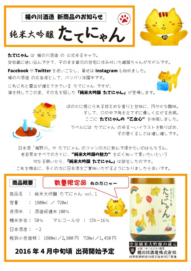 じわじわと露出が増えてきているたてにゃんですが、満を持してこの度、その名を冠した「純米大吟醸 たてにゃん」が登場します。