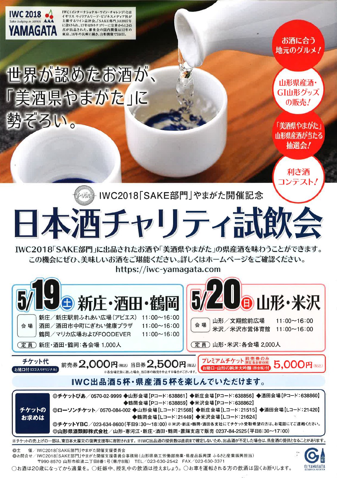 IWC2018「SAKE部門」やまがた開催記念として、日本酒チャリティ試飲会が開催されます。日付…2018年5月19日(土)~5月20日(日)時間…11:00‐16:00場所…5月19日:新庄・酒田・鶴岡 5月20日:山形・米沢※楯の川酒造は19日のみ酒田会場での出店となります。詳細は、こちらをご覧ください。皆様のお越しをお待ちしております。