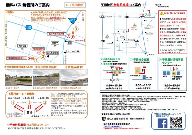 ※酒田駅前・平田地区内の複数箇所を巡回する無料バスの運行を予定しておりますので、そちらをご利用のうえご来場ください。