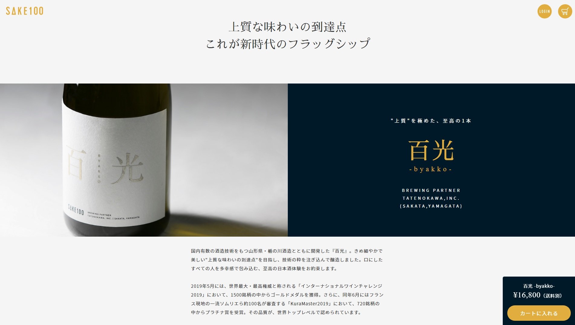 『百光』は楯の川酒造が特別醸造した日本酒で、SAKE100ブランドの第1弾としてリリースされました。