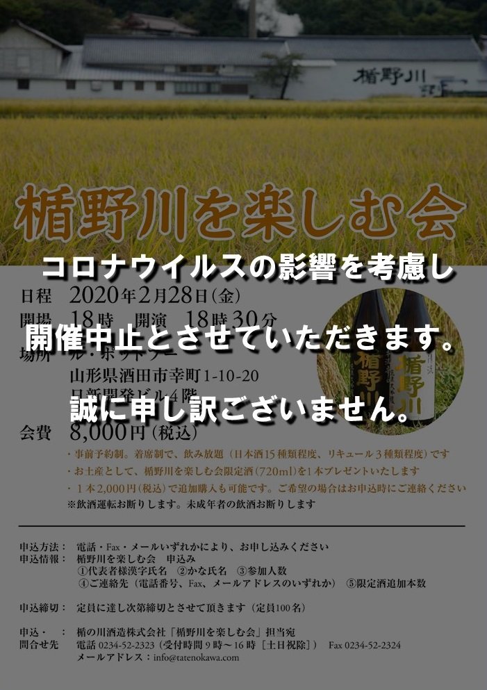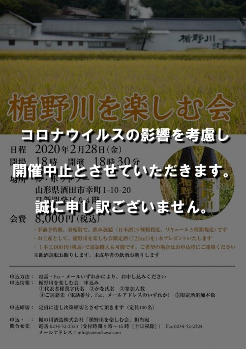 日本国内においても新型コロナウイルスの感染者が相次いで確認されており、今後増々の感染拡大が予想されます。そのような情勢の中、楯の川酒造におきましては、お客様の安全を最優先事項と考え、苦渋ながら、当会の中止を決断いたしました。