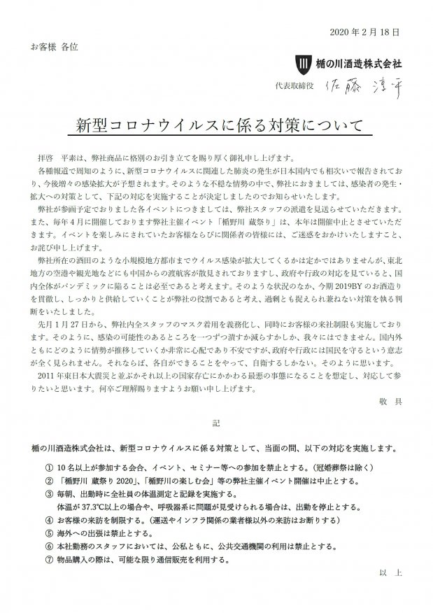 弊社所在の酒田のような小規模地方都市までウイルス感染が拡大してくるかは定かではありませんが、東北地方の空港や観光地などにも中国からの渡航客が散見されておりますし、政府や行政の対応を見ていると、国内全体がパンデミックに陥ることは必至であると考えます。そのような状況のなか、今期2019BYのお酒造りを貫徹し、しっかりと供給していくことが弊社の役割であると考え、過剰とも捉えられ兼ねない対策を執る判断をいたしました。
