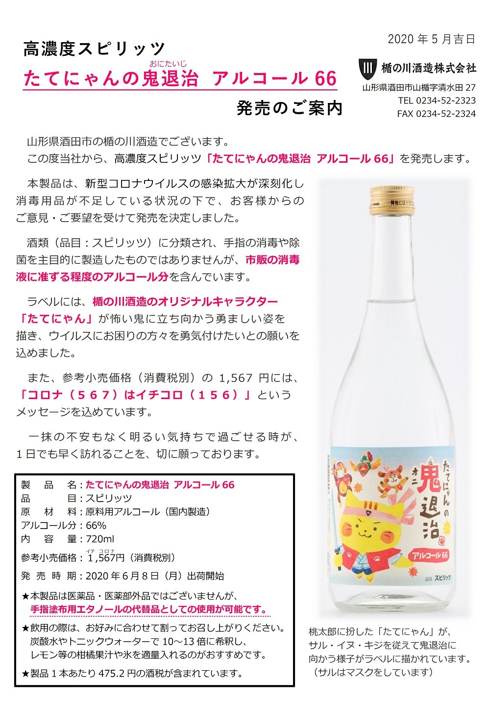 高濃度スピリッツ 「たてにゃんの鬼退治 アルコール66」発売のご案内